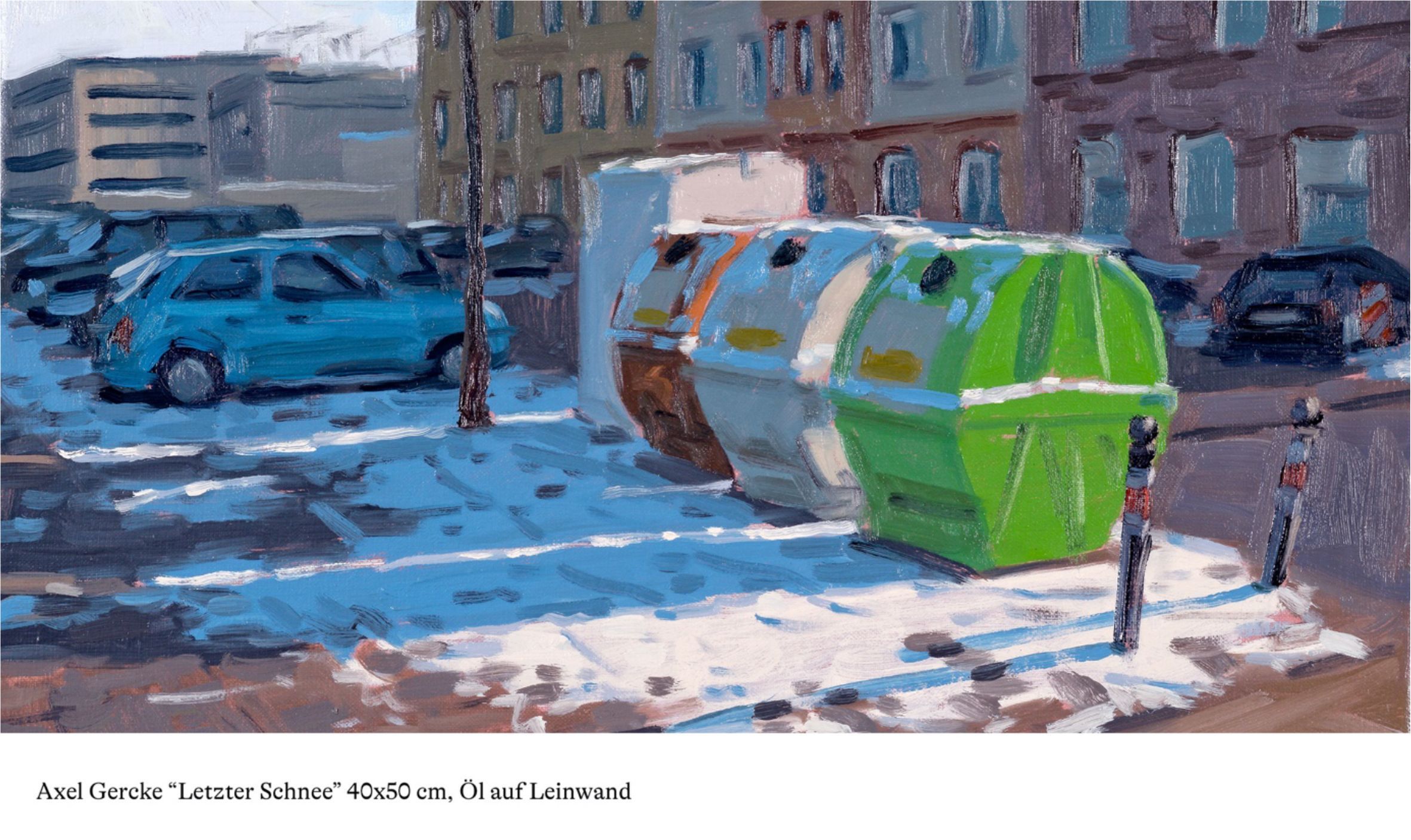 So überzeugte der Künstler Maximilian Gessler aus Nürnberg die Jury etwa mit seiner Arbeit „Hausstaub“. Sie zeigt eine Staubflocke, die mit einem Vergrößerungsgerät im Fotolabor auf Fotopapier belichtet wurde. Was meist nur als störender Abfall wahrgenommen wird, wird hier in den Mittelpunkt gestellt und so zum Kunstwerk erhoben. Auch Axel Gerckes Reproduktion eines Gemäldes von 2016 unter dem Titel „Letzter Schnee“, das eine Müllsammelstelle zeigt, hat die Jury als Motiv ausgewählt. „Der letzte Schnee und die Sonne lassen den kommenden Frühling erahnen“, so der Künstler.