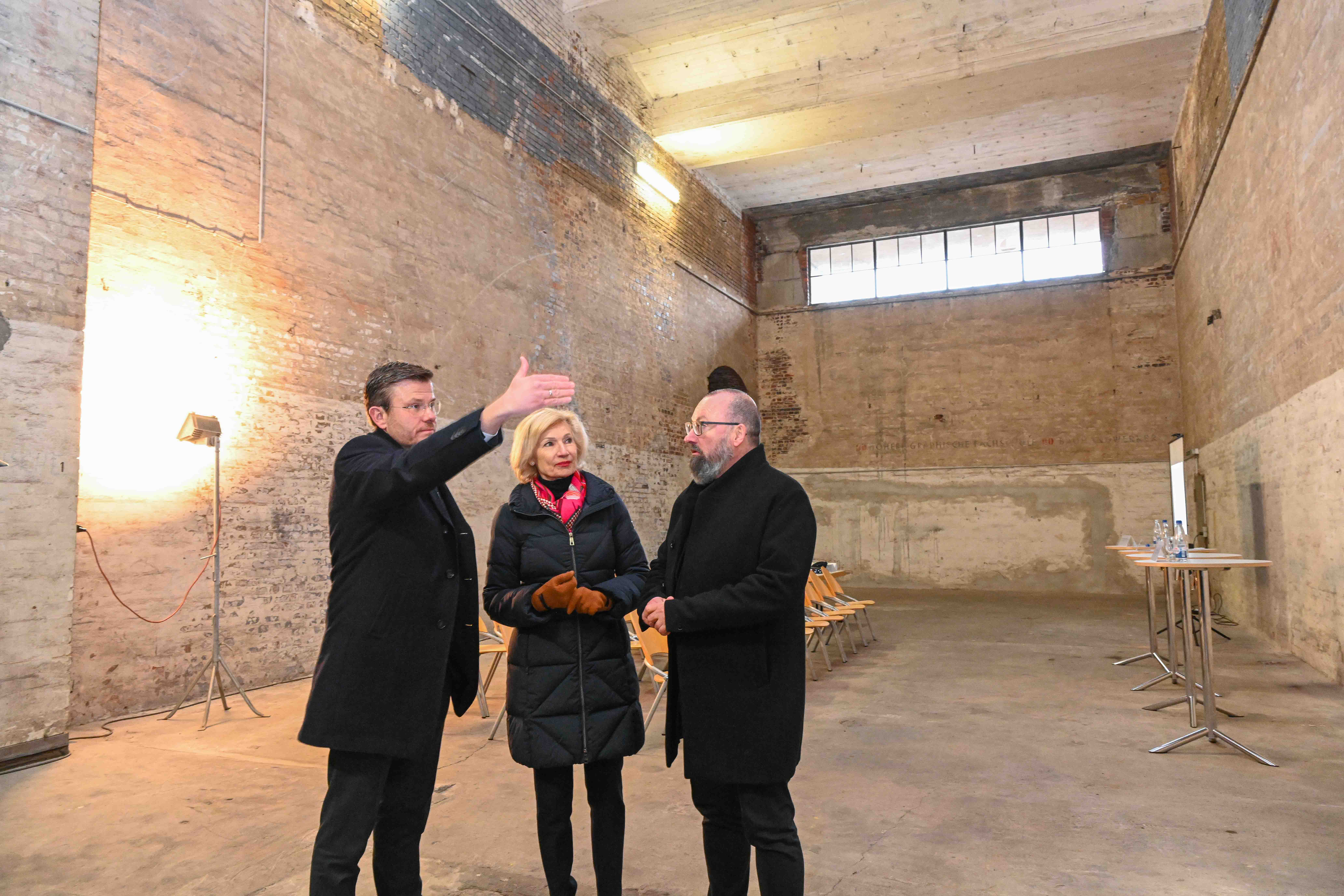 Oberbürgermeister Marcus König, Bürgermeisterin Prof. Dr. Julia Lehner und Prof. Dr. Hans-Joachim Wagner, Leiter der Stabsstelle Ehemaliges Reichsparteitagsgelände, informieren über den aktuellen Stand der Planungen zu den Ermöglichungsräumen in der Kongresshalle.