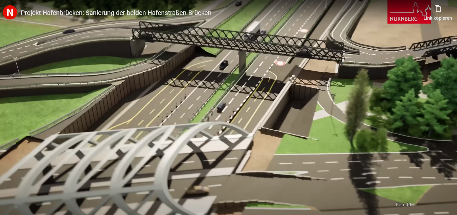 In seiner heutigen Sitzung am Donnerstag, 30. März 2023, hat der Werkausschuss Servicebetrieb Öffentlicher Raum Nürnberg (Sör) den Objektplan für den Neubau der Brücken Hafenstraße / Finkenbrunn beschlossen. Drei Großbrücken am Nürnberger Hafen stammen aus den 1970er Jahren und müssen ersetzt werden. Nachdem der Objektplan für die Frankenschnellweg-Brücke über den Main-Donau-Kanal bereits im Dezember 2022 beschlossen worden war, folgten in der heutigen Sitzung nun die beiden anderen Brücken über den Kanal und die Südwesttangente.