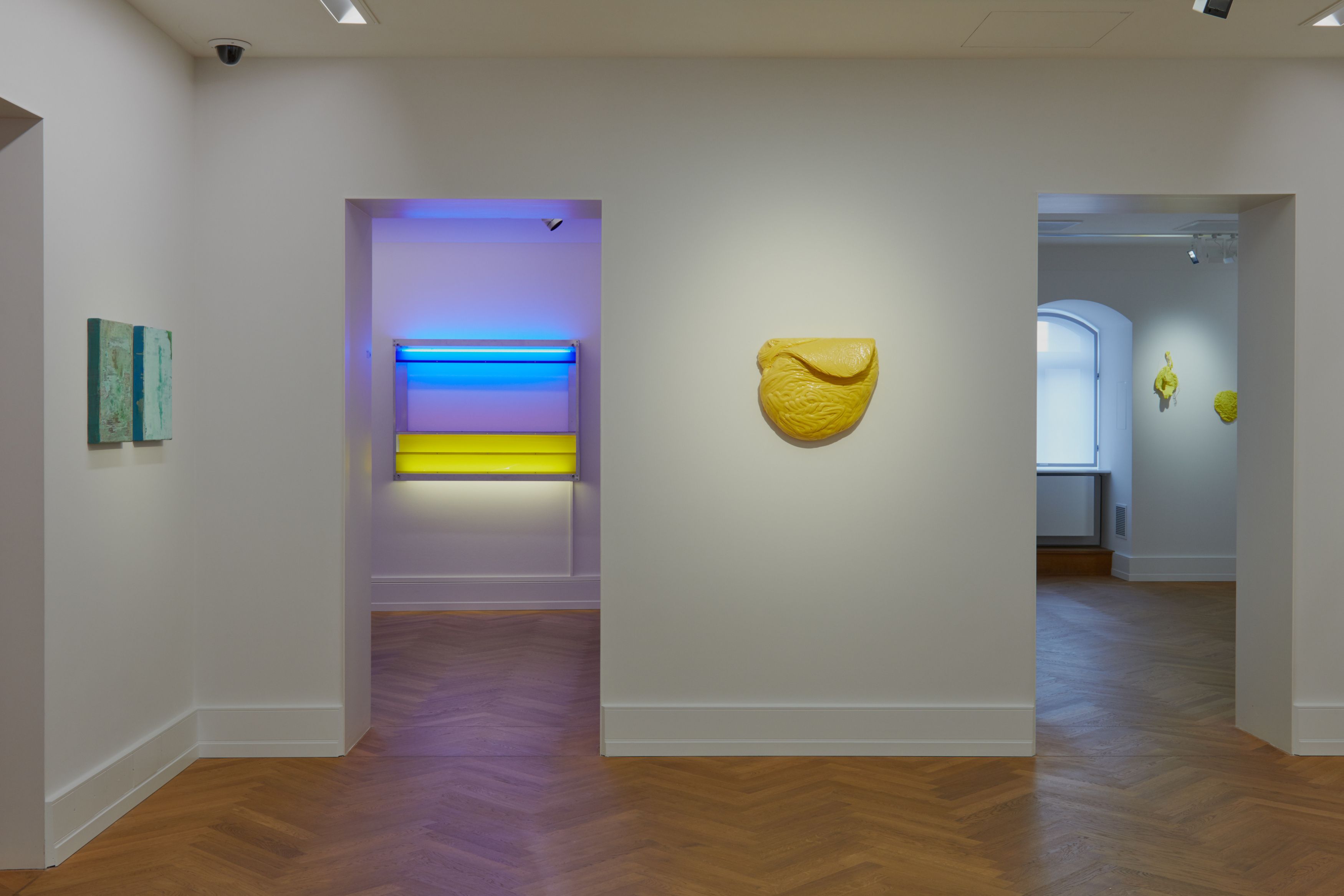 „Naturstoff / Kunststoff. Materialität in der Nürnberger Kunst“ (bis 11. Juni 2023) mit Werken (von links) von Joachim Kersten, Verdigris Nr. 23, 2019; Verdigris Nr. 21, 2019, beide Copyright: VG Bild-Kunst, Bonn 2023; Reiner Bergmann, Flair III, 1994/1998; Fred Ziegler, Kunst-stoff, 2017; (Ausschnitt aus) Poly Splash, 2017