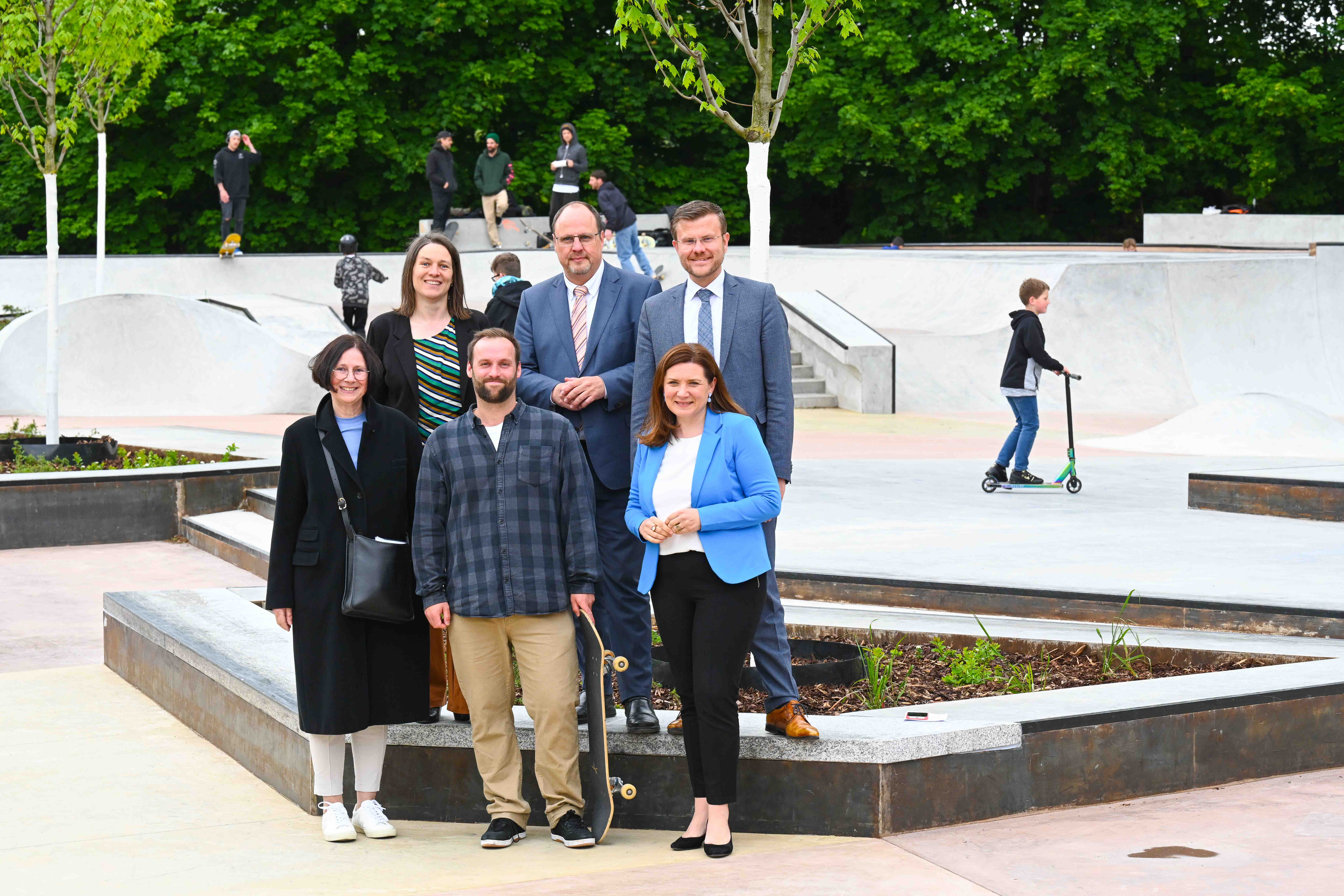 Großer Bahnhof für die neue Skateanlage an der Münchener Straße im Volkspark Dutzendteich: (hintere Reihe, von links) Die Referentin für Jugend, Familie und Soziales, Elisabeth Ries, Bürgermeister und Erster Werkleiter des Servicebetriebs Öffentlicher Raum Nürnberg, Christian Vogel, Oberbürgermeister Marcus König und (vordere Reihe von links) Baudirektorin Katharina Sauer von der Regierung von Mittelfranken, der Vertreter des Skate Hub e. V., Christoph Sausner, sowie die Referentin für Schule und Sport, Cornelia Trinkl, eröffneten am Mittwoch, 17. Mai 2023, die neue Anlage.