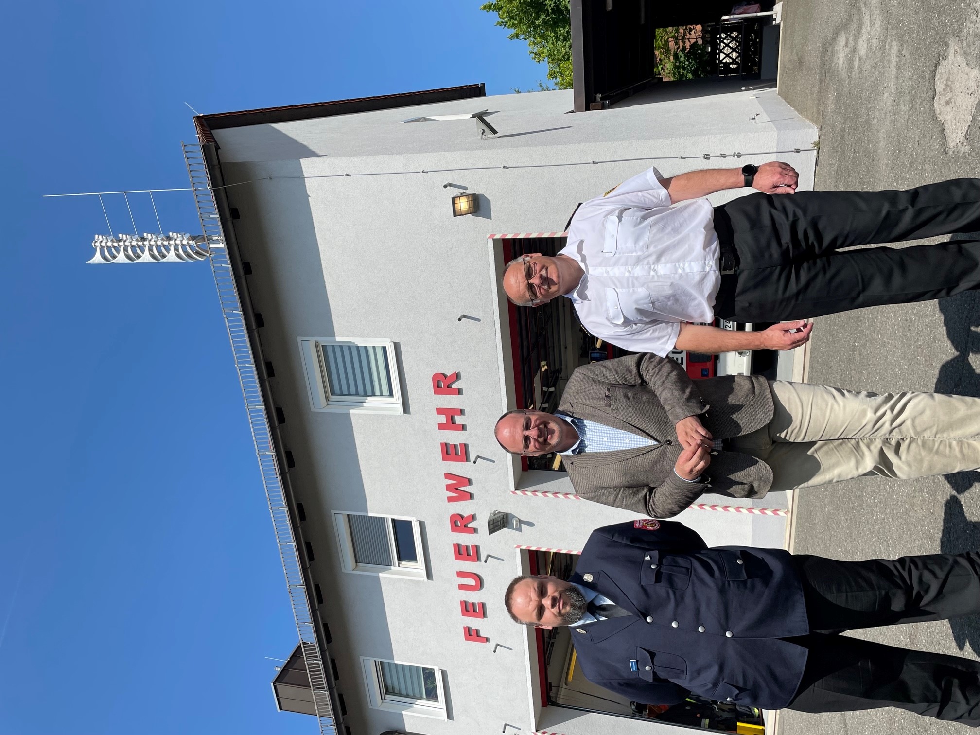 Von links nach rechts: Der Kommandant der Freiwilligen Feuerwehr Altenfurt, Sebastian Knees, Feuerwehr-Bürgermeister Christian Vogel und der Leiter der Feuerwehr Nürnberg, Stadtbranddirektor Volker Skrok, haben am Donnerstag, 25. Mai 2023, die 100. von insgesamt 106 Warnsirenen auf dem Dach des Feuerwehrgerätehauses in Nürnberg-Altenfurt in Betrieb genommen.