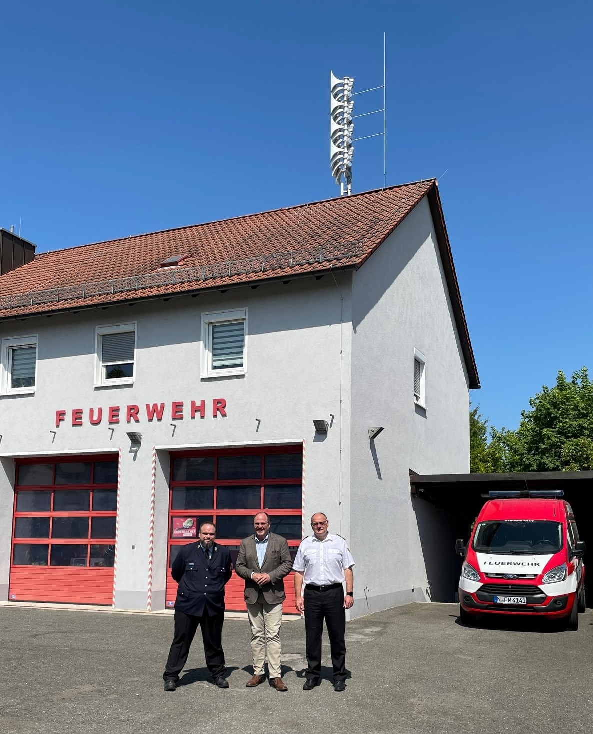 Von links nach rechts: Der Kommandant der Freiwilligen Feuerwehr Altenfurt, Sebastian Knees, Feuerwehr-Bürgermeister Christian Vogel und der Leiter der Feuerwehr Nürnberg, Stadtbranddirektor Volker Skrok, haben am Donnerstag, 25. Mai 2023, die 100. von insgesamt 106 Warnsirenen auf dem Dach des Feuerwehrgerätehauses in Nürnberg-Altenfurt in Betrieb genommen