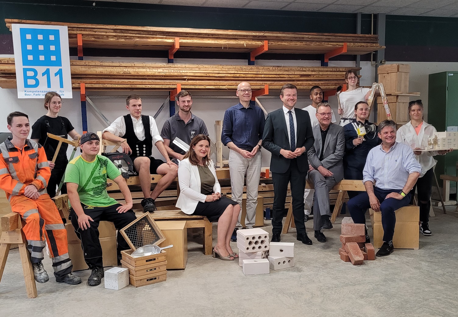Schülerinnen und Schüler des Kompetenzzentrums für Bau-, Farb- und Holzberufe (Berufliche Schule 11) mit Cornelia Trinkl (Schulreferentin, Mitte sitzend), Prof Dr. Niels Oberbeck (Präsident der TH Nürnberg, 7.v.l.), Marcus König (Oberbürgermeister der Stadt Nürnberg, 7.v.r.) und Prof. Dr. Joachim Hornegger (Präsident der FAU, 2.v.r.).