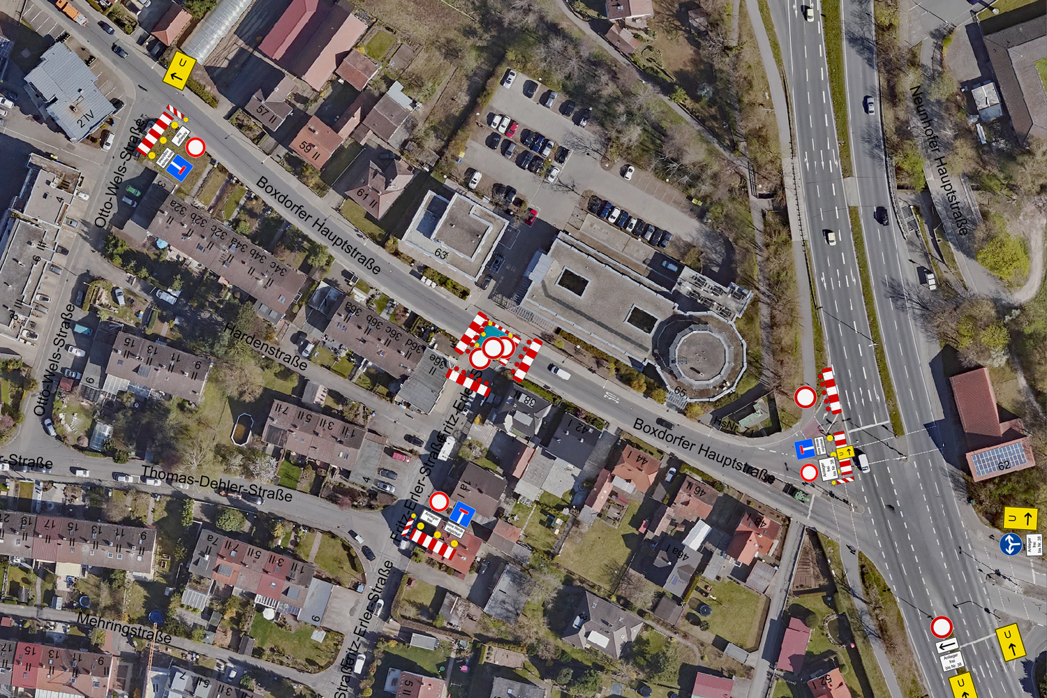 Die Übersichtskarte zeigt die Sperrung der Boxdorfer Hauptstraße.