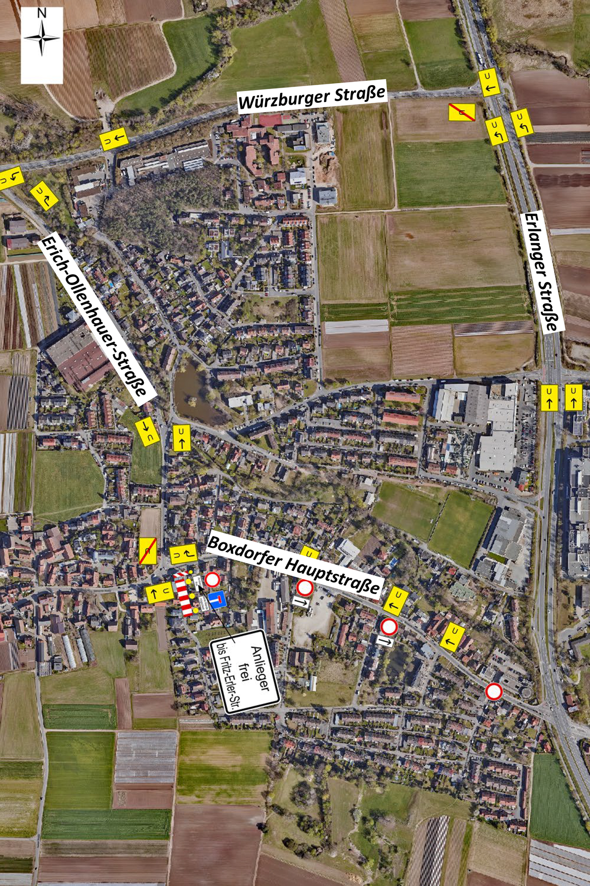 Aufgrund der Vollsperrung kann Boxdorf nicht über die Erlanger Straße angefahren werden. Auch die Ausfahrt von Boxdorf auf die Erlanger Straße ist nicht möglich. Eine Umleitungsempfehlung ist ab der Kreuzung Erlanger Straße, Moosäckerstraße, Alfred-Rohrmüller-Straße ausgeschildert und führt im weiteren Verlauf der Erlanger Straße über die Würzburger Straße zur Erich-Ollenhauer-Straße und von dort in die Boxdorfer Hauptstraße. tom