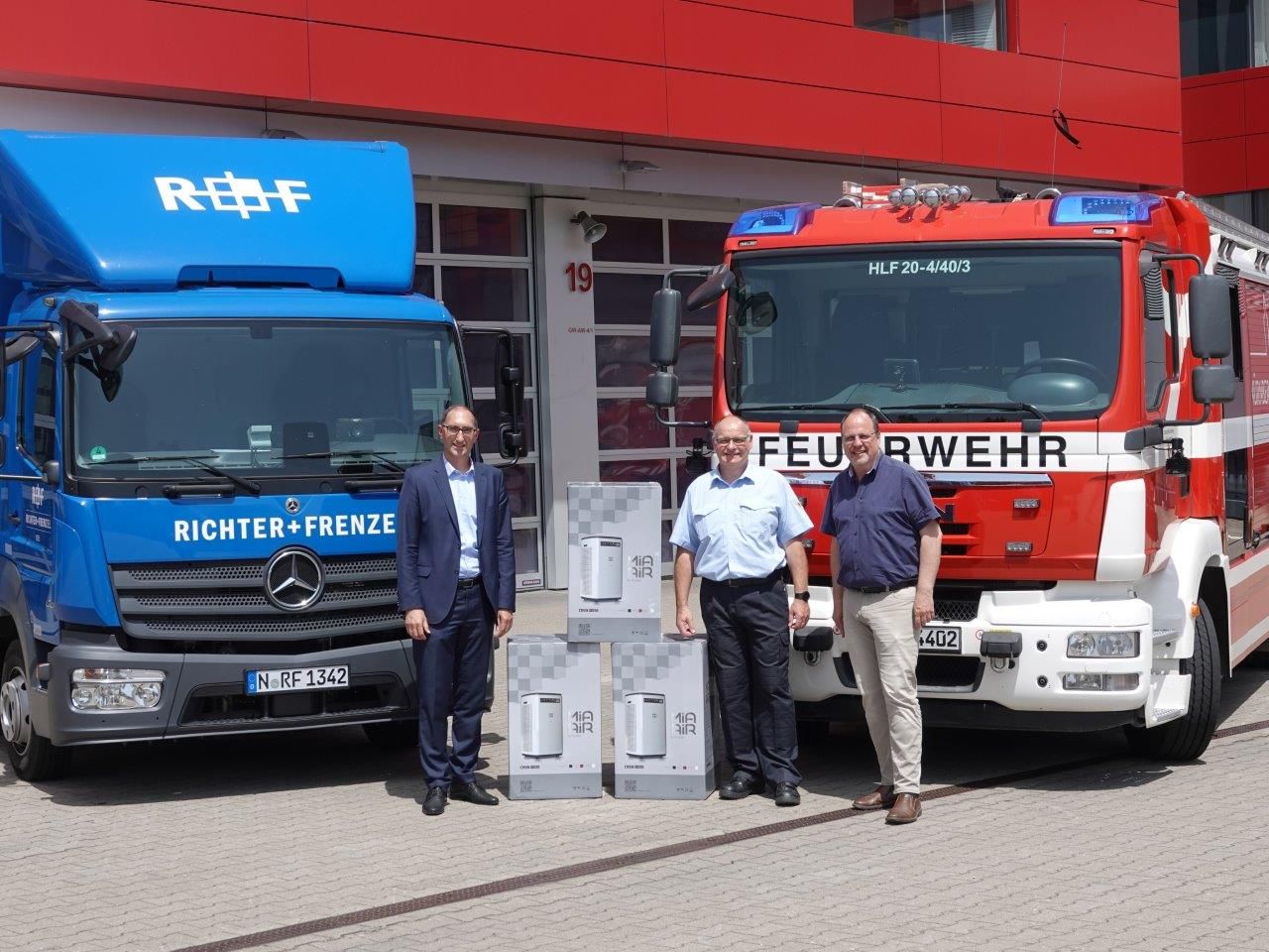 Geschäftsführer Dominik Beierlorzer, Richter+Frenzel, übergibt die Luftreiniger an Oberbranddirektor Volker Skrok und Bürgermeister Christian Vogel (von links).