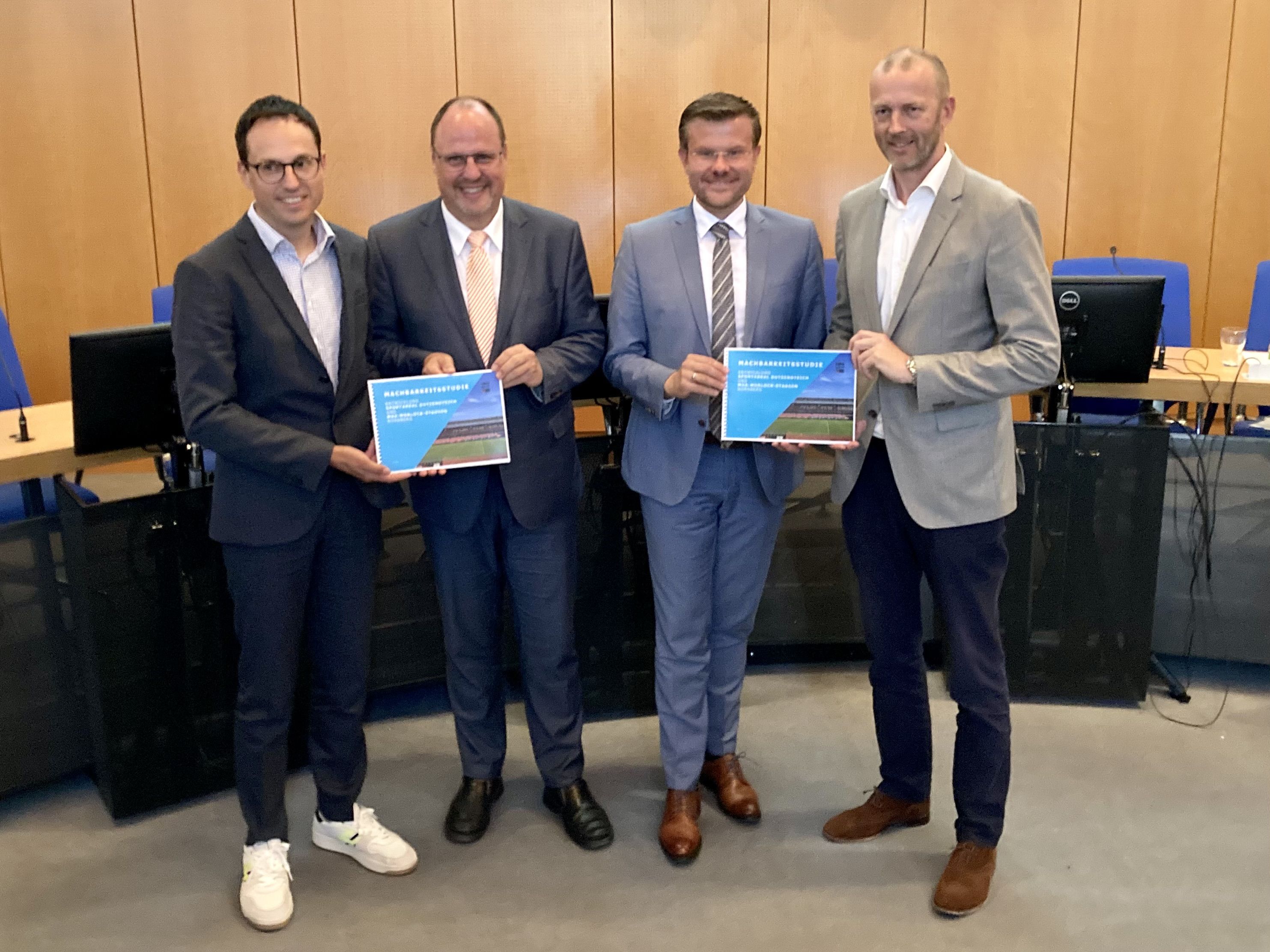 Der Anstoß ist getan: Am heutigen Freitag, 7. Juli 2023 stellten (v.l.n.r.) Projektleiter Immanuel Geis, PROPROJEKT, Bürgermeister Christian Vogel, Oberbürgermeister Marcus König und Niels Rossow, kaufmännischer Vorstand 1. FC Nürnberg e. V., die Machbarkeitsstudie zur Stadionentwicklung vor.