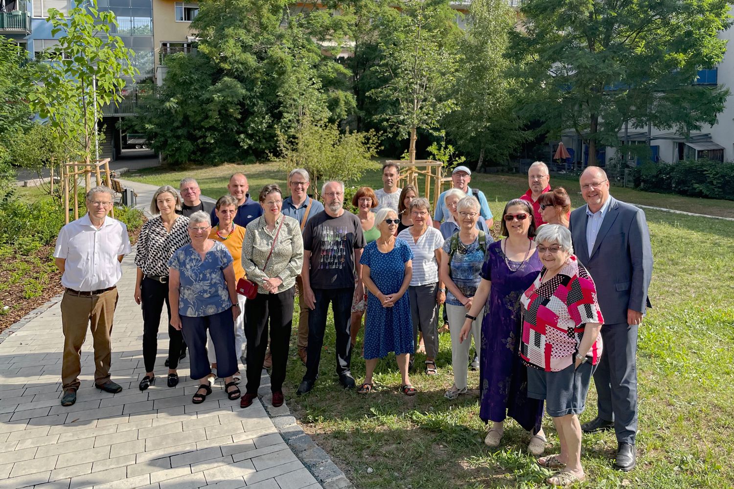 Bild Download: Gruppenbild mit Bürgermeister Christian Vogel sowie Anwohnerinnen und Anwohner in der neugestalteten Grünanlage Neubleiche