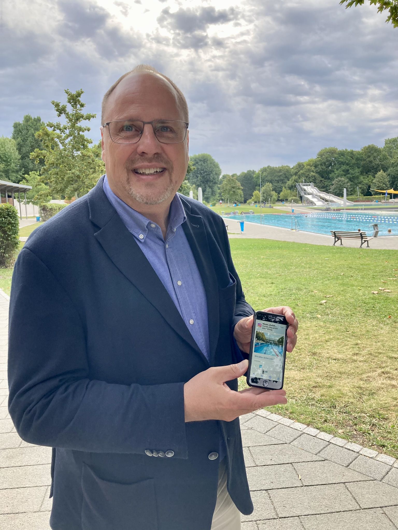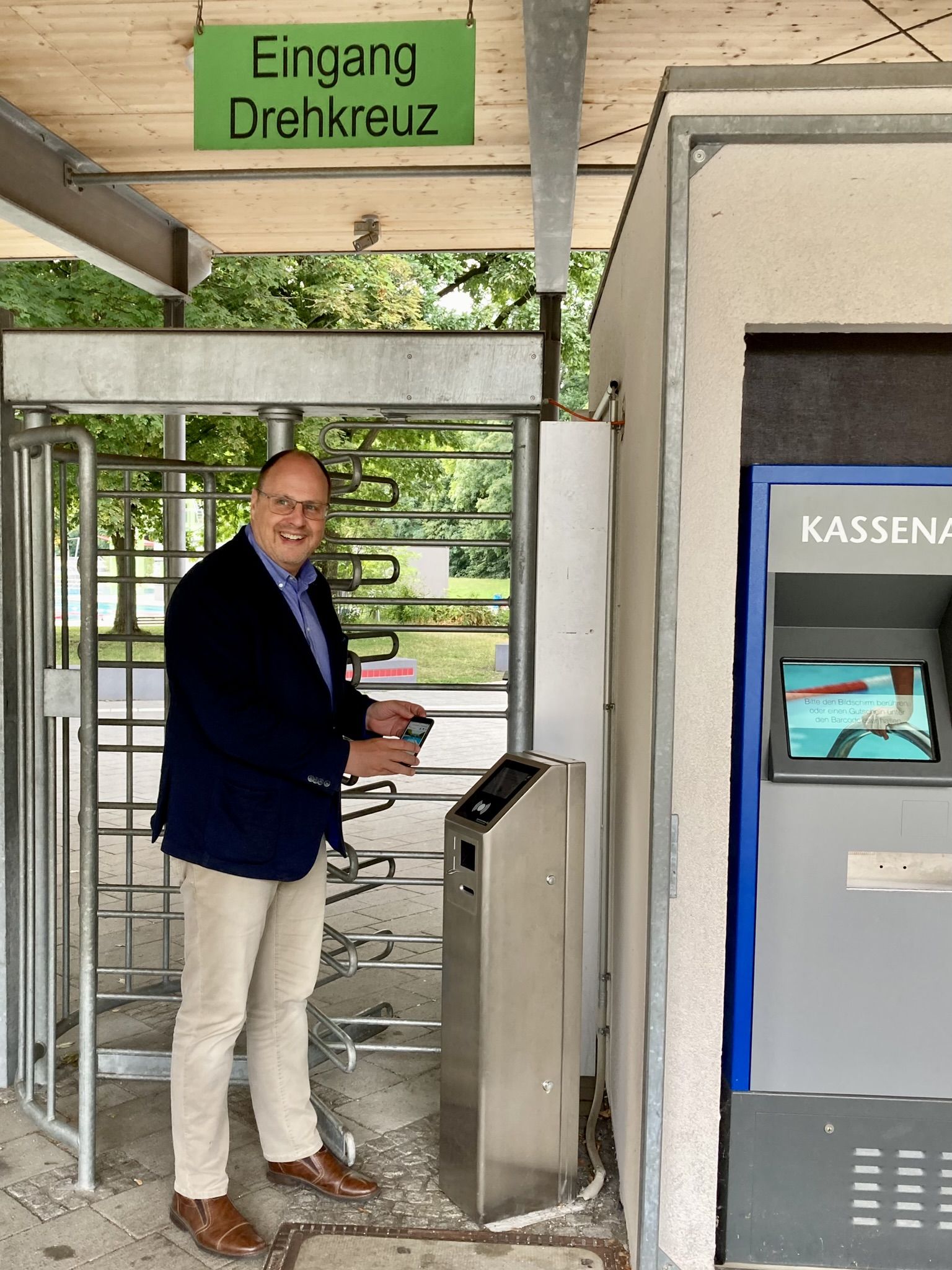 Bild Download: Bürgermeister Christian Vogel, Erster Werkleiter des städtischen Eigenbetriebs NürnbergBad, testet das Online-Ticket am Westbad.