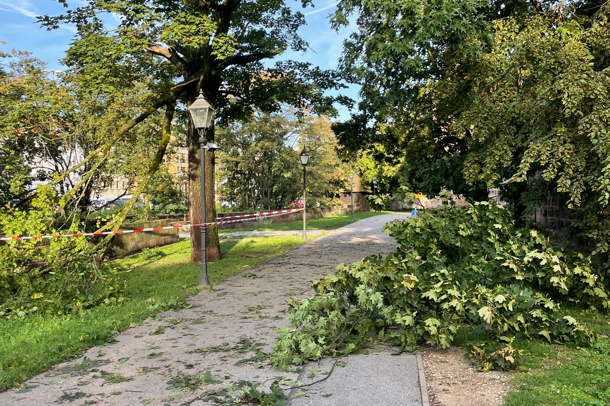 Bild Download: Abgebrochene Äste an der Frauentormauer. Die Äste hängen zum Teil noch in der Krone und können herunterfallen. Hier sollten sich Passantinnen und Passanten fernhalten.