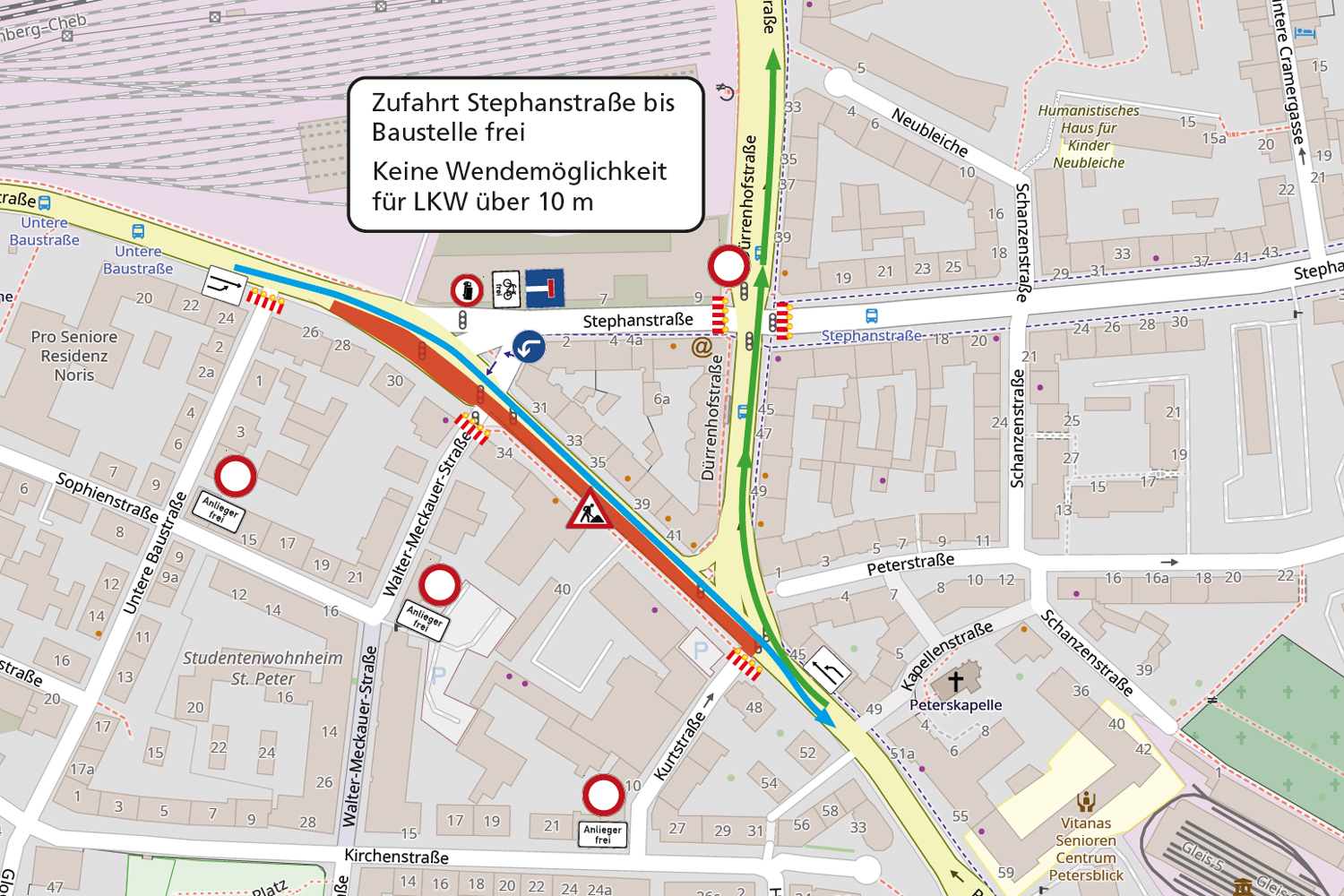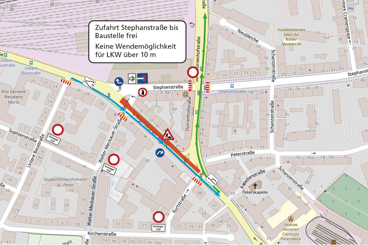 Die Sanierung ist in zwei Abschnitte unterteilt. Erster Abschnitt: Von Montag, 28. August, bis Samstag, 2. September, wird die Fahrspur in Richtung Hauptbahnhof saniert. Der motorisierte Verkehr in Richtung Zentrum wird dann durch die Dürrenhofstraße in Richtung Norden zur Bahnhofstraße geleitet. Für die Dauer der Baustelle gilt für die Untere Baustraße, die Walter-Meckauer-Straße und die Kurtstraße eine Sackgassen-Regelung und die Einfahrt in die Regensburger Straße ist nicht möglich. Die Fußwege sind weiterhin ohne Einschränkung nutzbar. Die Stephanstraße bleibt weiterhin für den Durchgangsverkehr gesperrt und wird in Höhe der Kreuzung Dürrenhofstraße zur Sackgasse. Die Zu- und Ausfahrt zum Abschnitt zwischen Regensburger Straße und Dürrenhofstraße kann ausschließlich über die Regensburger Straße erfolgen. Für Kraftfahrzeuge und Lastkraftwägen, die eine Länge von zehn Metern überschreiten, besteht keine Wendemöglichkeit. Der Abschnitt zwischen Schanzenstraße und Dürrenhofstraße kann mit Kraftfahrzeugen nur aus Richtung Burgerstraße erreicht werden.