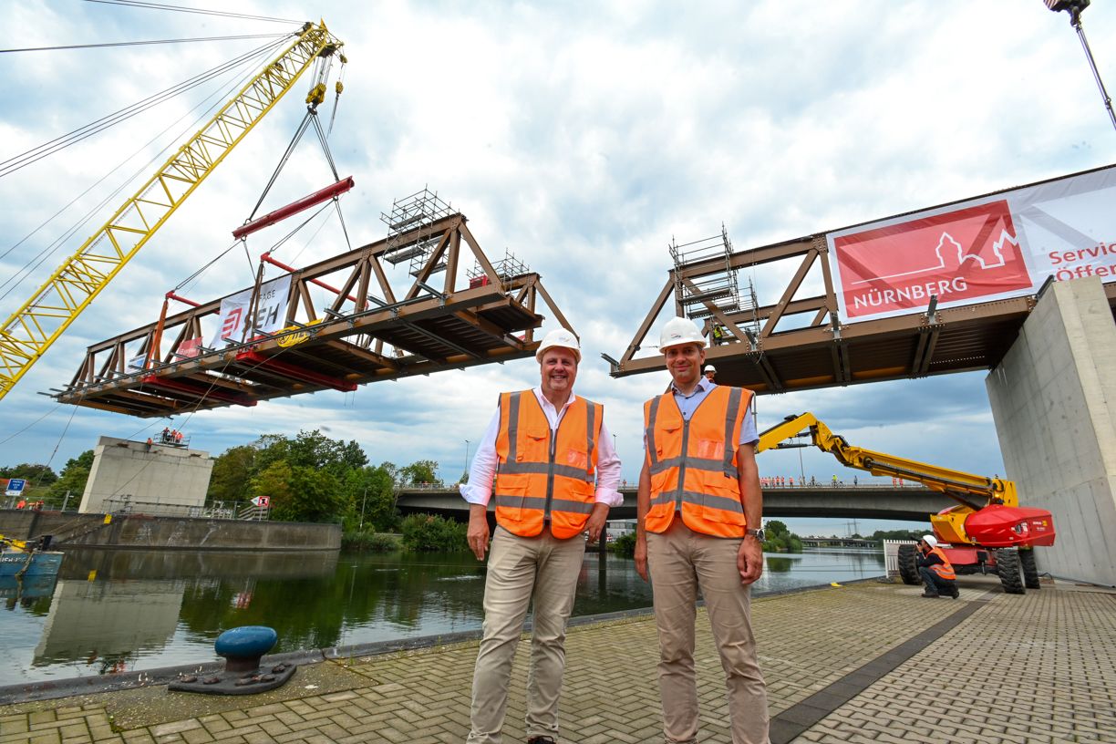 Projekt Hafenbrücken – Montage der Behelfsbrücken am Freitag, 25. August 2023: Bürgermeister und Erster Werkleiter des Servicebetriebs Öffentlicher Raum Nürnberg (Sör), Christian Vogel (links), und Sör-Projektleiter Hafenbrücken, Bernhard Homering.