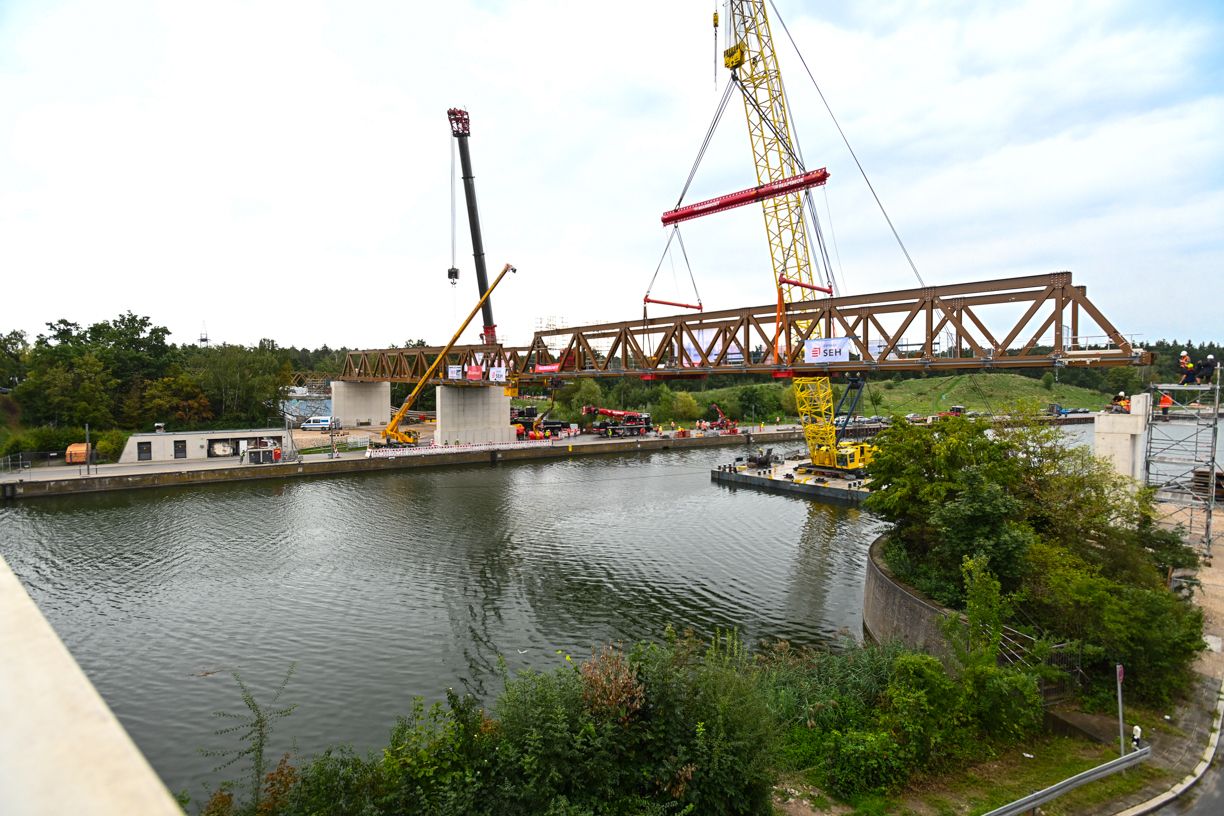 Mit dem Einbau von Brückenkörpern aus Stahl nehmen die Behelfsbrücken über den Main-Donau-Kanal und die Autobahn 73 (A73) von Freitag bis Sonntag, 25. bis 27. August 2023, Gestalt an. Autokräne, darunter der größte Mobilkran Deutschlands und ein Schwimmkran aus Duisburg, haben am Freitag einen Brückenkörper mit 56 Metern Länge und 192 Tonnen Gewicht auf die Pfeiler gehoben. Diese Bauarbeiten an der Anschlussstelle Nürnberg-Hafen-Ost sind ein wichtiger Schritt auf dem Weg zum Abbruch und Neubau der beiden Hafenbrücken zwischen der Straße Finkenbrunn und der Hafenstraße. Die aus den 1970er-Jahren stammenden Brücken am Nürnberger Hafen müssen durch Neubauten ersetzt werden. Der Verkehr muss auch während des Abbruchs und des Neubaus fließen. Deshalb errichtet der Servicebetrieb Öffentlicher Raum Nürnberg (Sör) vorab je eine provisorische Behelfsbrücke über den Main-Donau-Kanal und die Südwesttangente. Nach deren Fertigstellung werden die alten Brücken zurückgebaut. Während der aktuellen Brückenbauarbeiten ist die A73 von Samstag, 26. August, ab 21 Uhr bis Sonntag, 27. August, 22 Uhr, zwischen der Anschlussstelle Nürnberg-Hafen-Süd und dem Kreuz Nürnberg-Hafen komplett gesperrt. Umleitungen sind ausgeschildert.